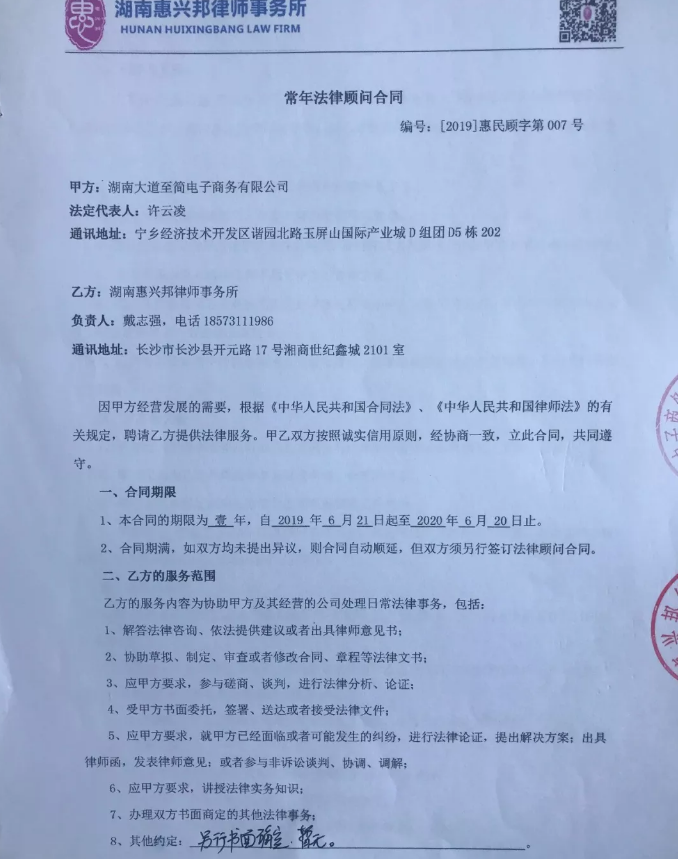 祝賀惠興邦與湖南祥祥源家居有限公司、湖南大道至簡電子商務有限公司、長沙華夏智謀文化有限公司分別簽訂常年法律顧問合同