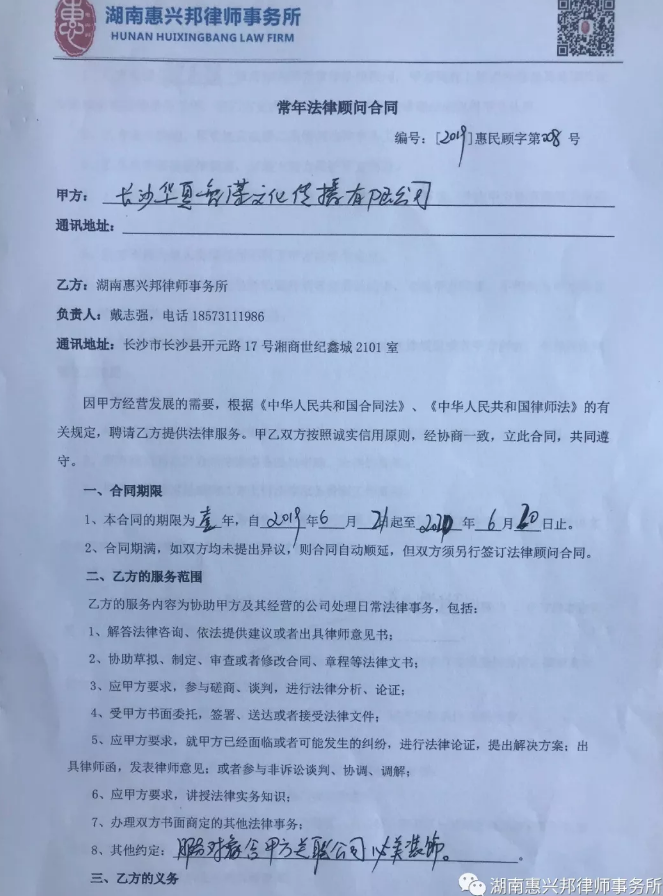 近日,湖南惠興邦律師事務所與湖南祥祥源家居有限公司、湖南大道至簡電子商務有限公司、長沙華夏智謀文化有限公司三公司分別簽訂《常年法律顧問合同》,其中與長沙華夏智謀文化有限公司系續簽常年法律顧問合同,由惠興邦提供日常法律咨詢,起草、審查及修改合同,協助參與重大經營項目的談判及出具相關法律意見,代理訴訟等法律服務。